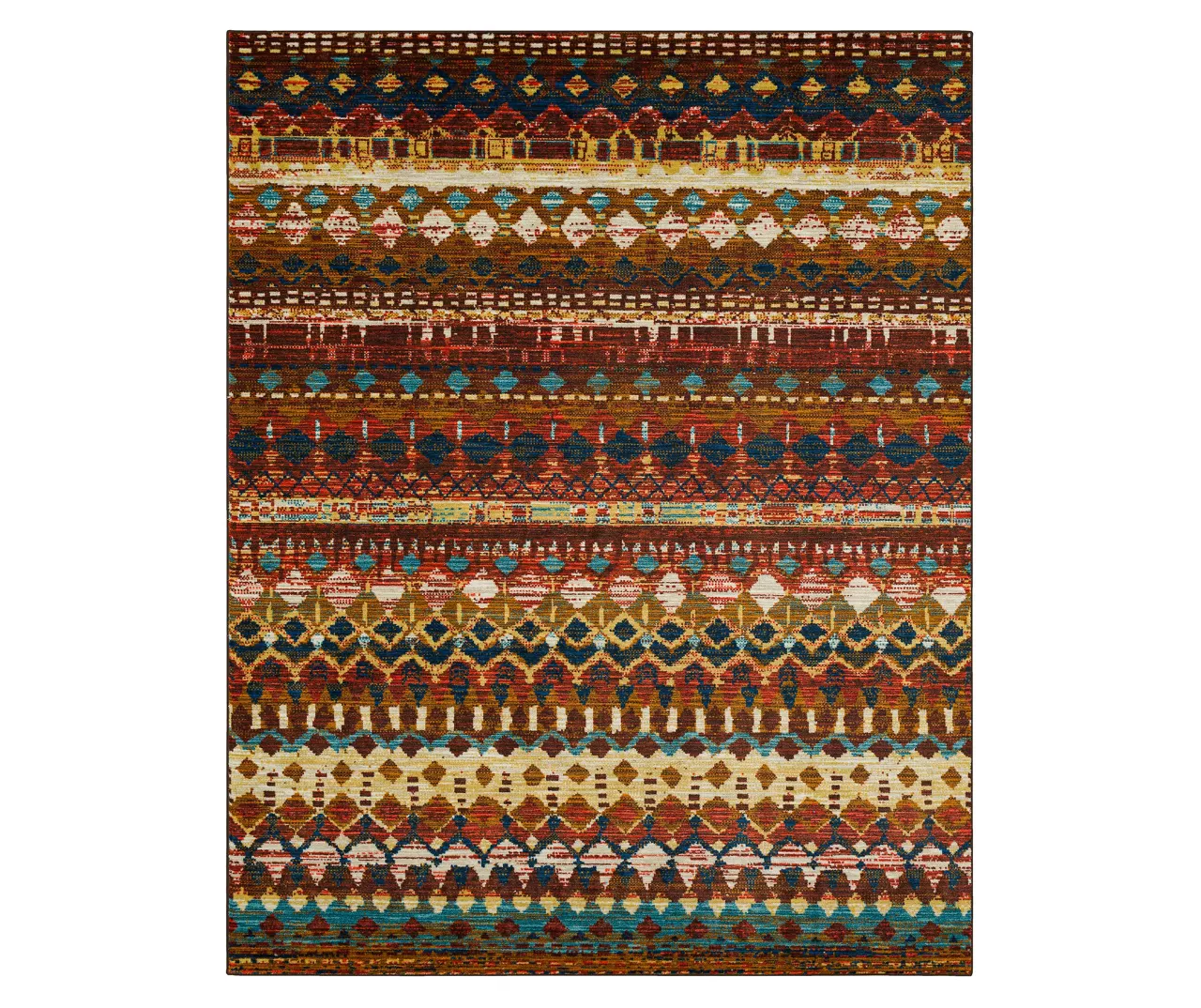Mohawk Home’s Gulla Stripe area rug features an array of vibrant color within a reimagined Southwest blanket-inspired design. A striated background is overlaid with a bold geometric pattern to create a stunning modern design. Thoughtfully crafted in the U.S.A. utilizing Mohawk Home’s exclusive precision dye-injected printer, this rug is designed on a plush EverStrand™ tufted base made from premium recycled polyester. A non-skid latex backing helps to keep things in place, and the low pile is durably designed to easily work with doorways or furniture while withstanding everyday use.