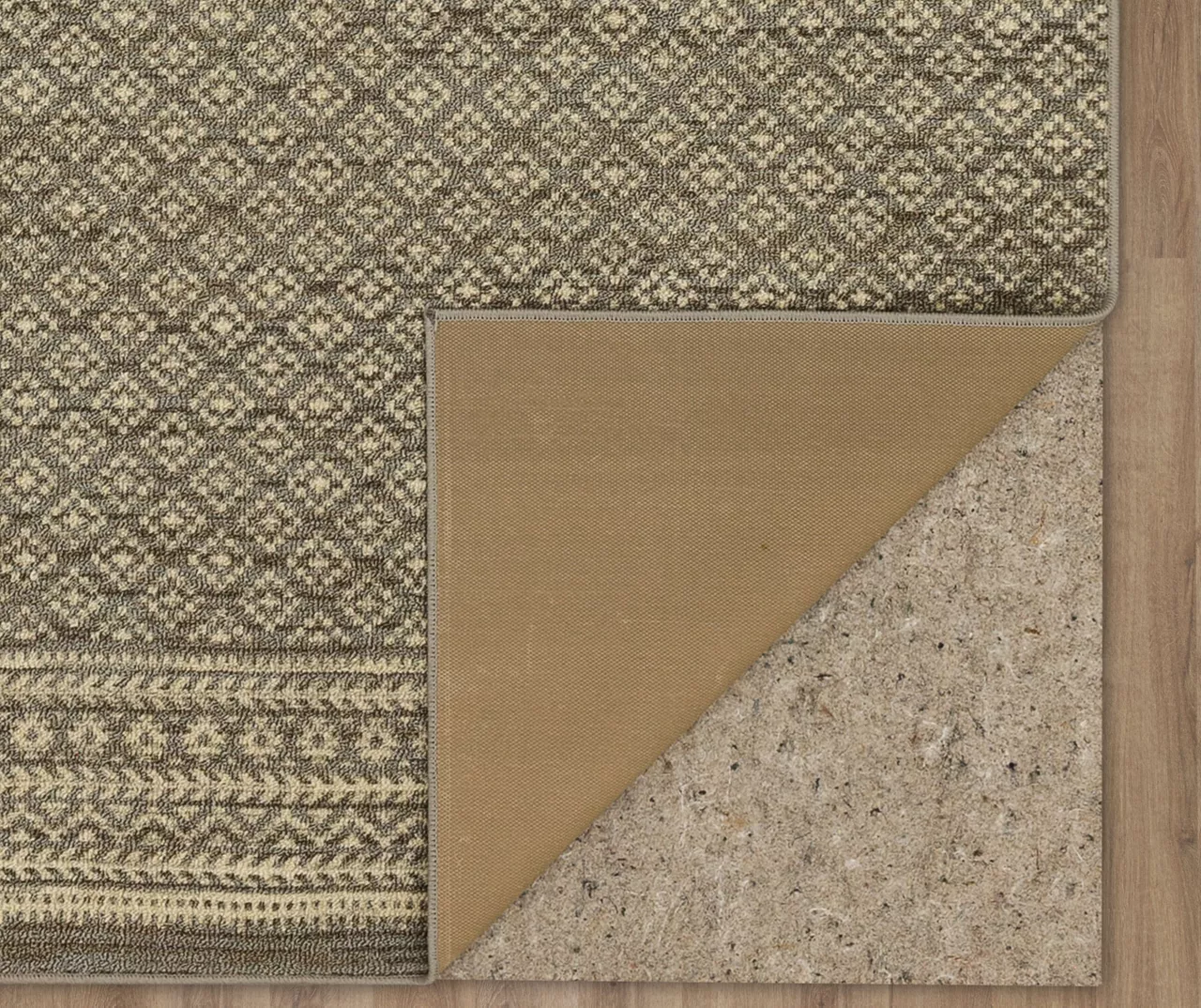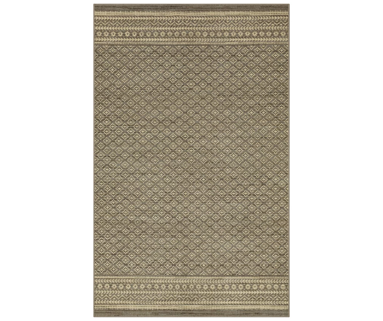 - Intricate geometric pattern and bordering in a neutral palette for a modern boho look