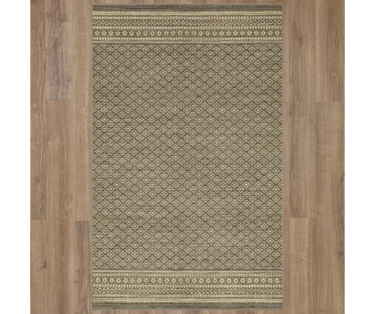 - Intricate geometric pattern and bordering in a neutral palette for a modern boho look