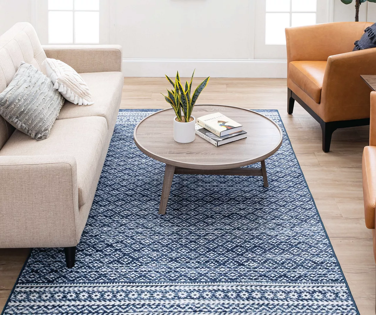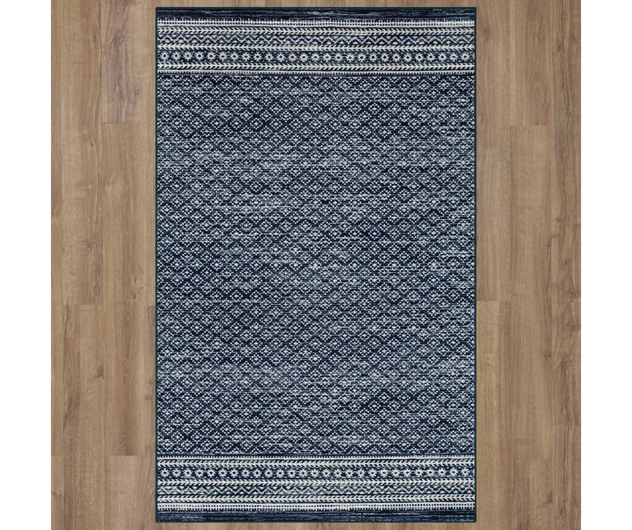 The Mohawk Home Harley Hill area rug features a geometric motif in a rich navy and white color palette that is sure to perfectly accent any room. The low pile is created with Mohawk’s premium wear-dated nylon fiber for a soft touch and dependable durability. This rug is sure to make an elegant addition to a bedroom or other living space and the non-skid latex backing helps to keep things in place.