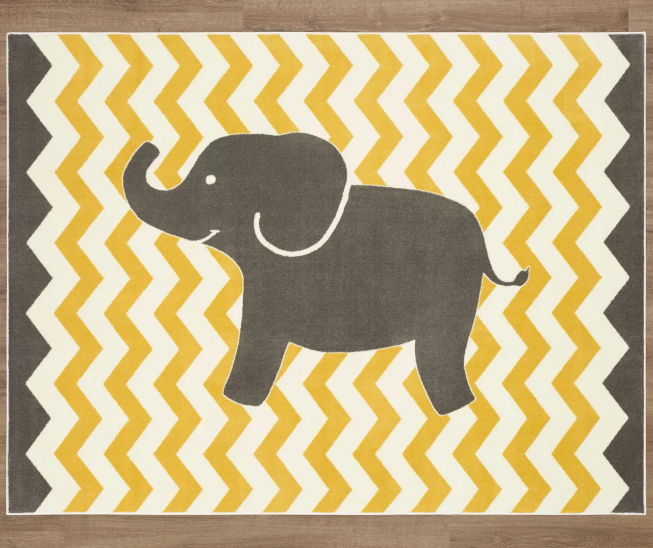 - Gray elephant design over mustard and white zigzag stripes