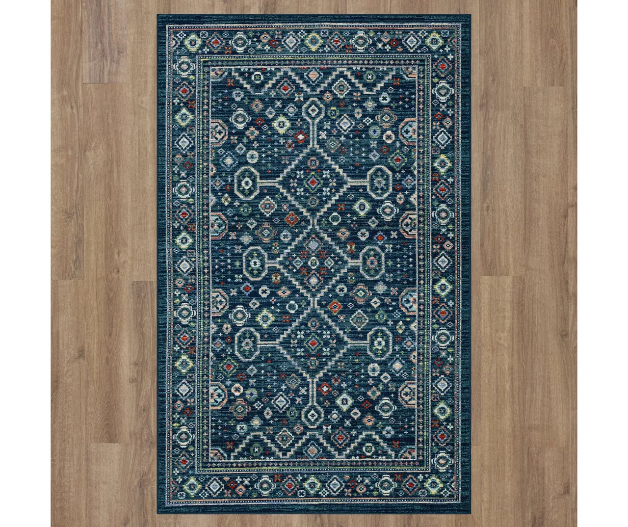 - Ornamental design with geometric elements in shades of navy and green for a traditional look