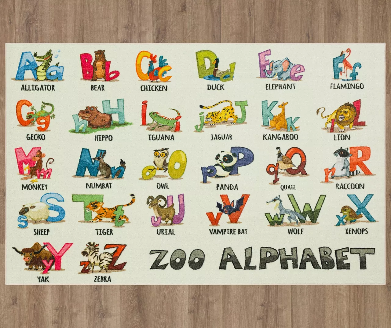 - Colorful alphabet and animal design with the words “zoo alphabet” along the bottom and the names of each animal spelled out