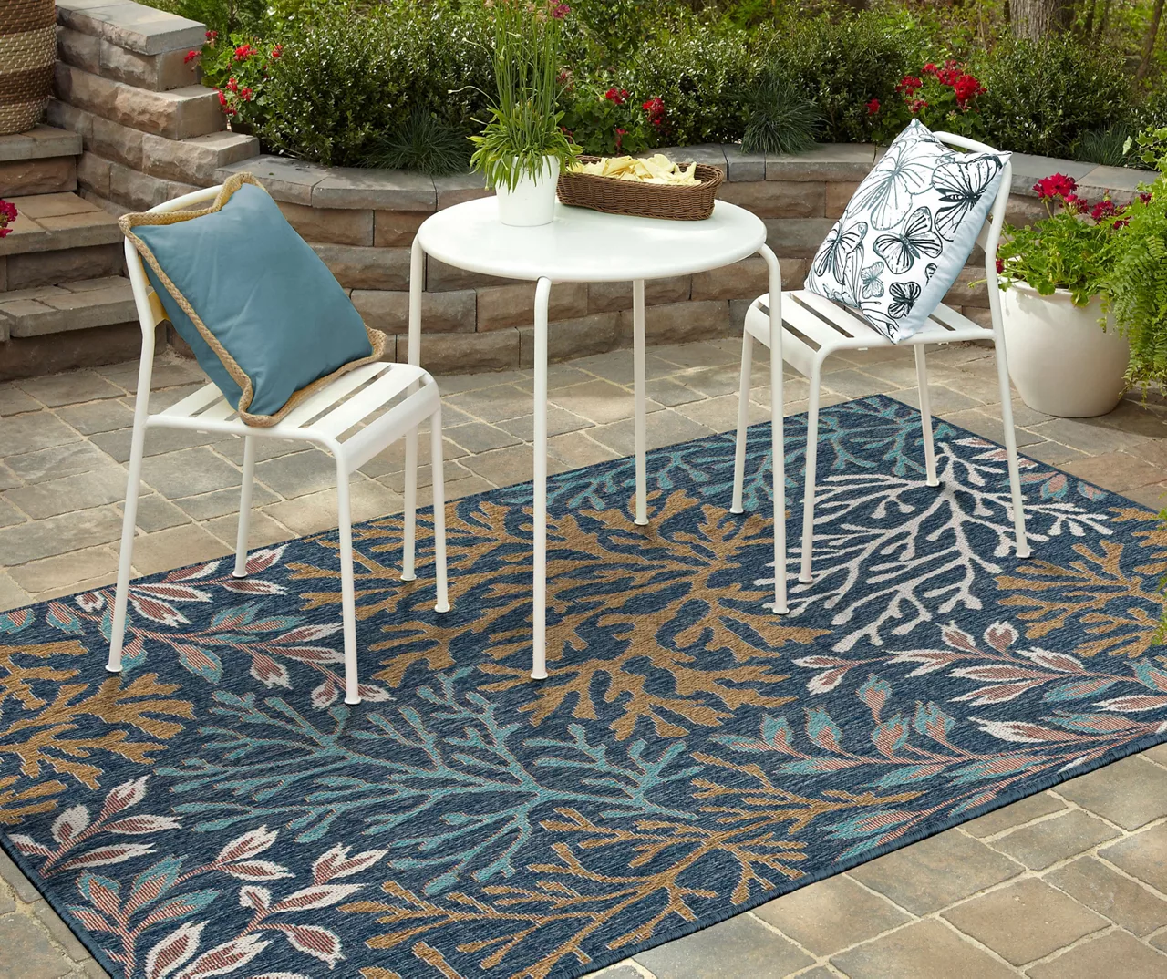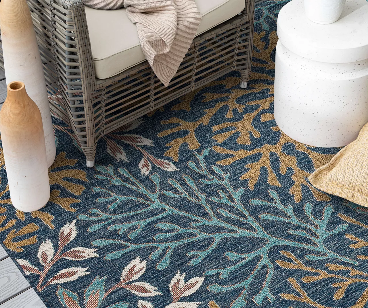 The Mohawk Home Coastal Cove area rug features a coastal design in rich palette of blue, brown and white that easily complements your decor. Made with all-weather olefin polypropylene yarn, this flatwoven area rug offers a detailed design, soft feel and dependable durability that works in both indoor and outdoor spaces. The resilient surface fibers are resistant to stains, fading and moisture, making it a great choice for high-traffic areas.