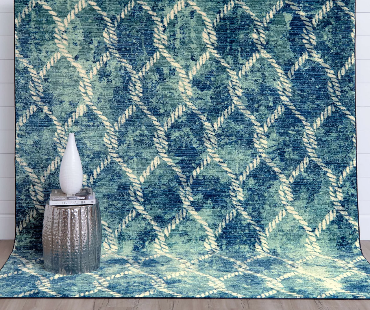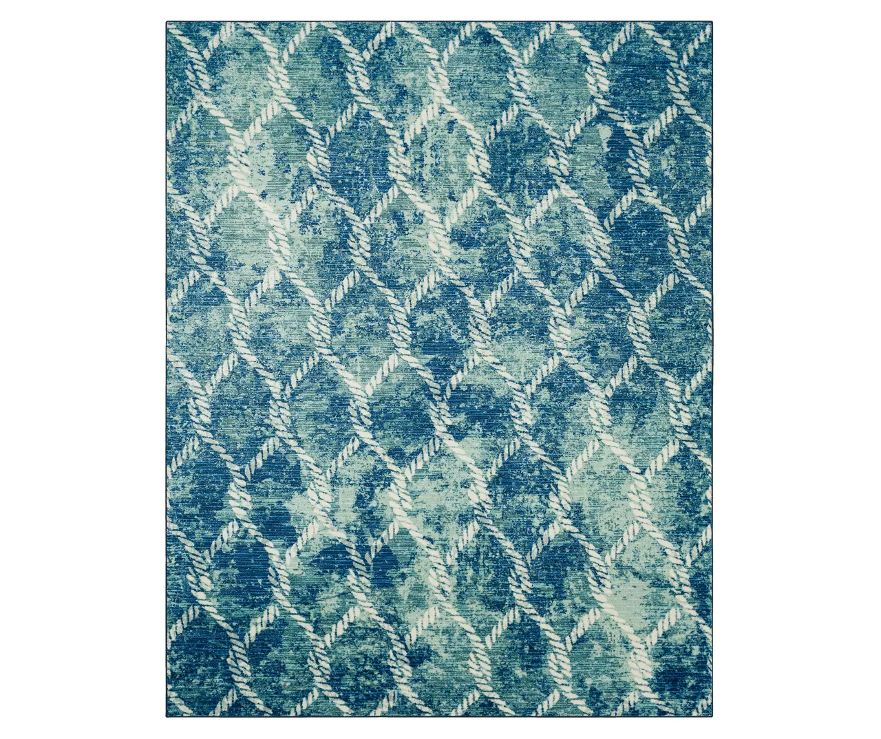 - Diamond lattice pattern with a rope look in soothing shades of aqua, blue and white