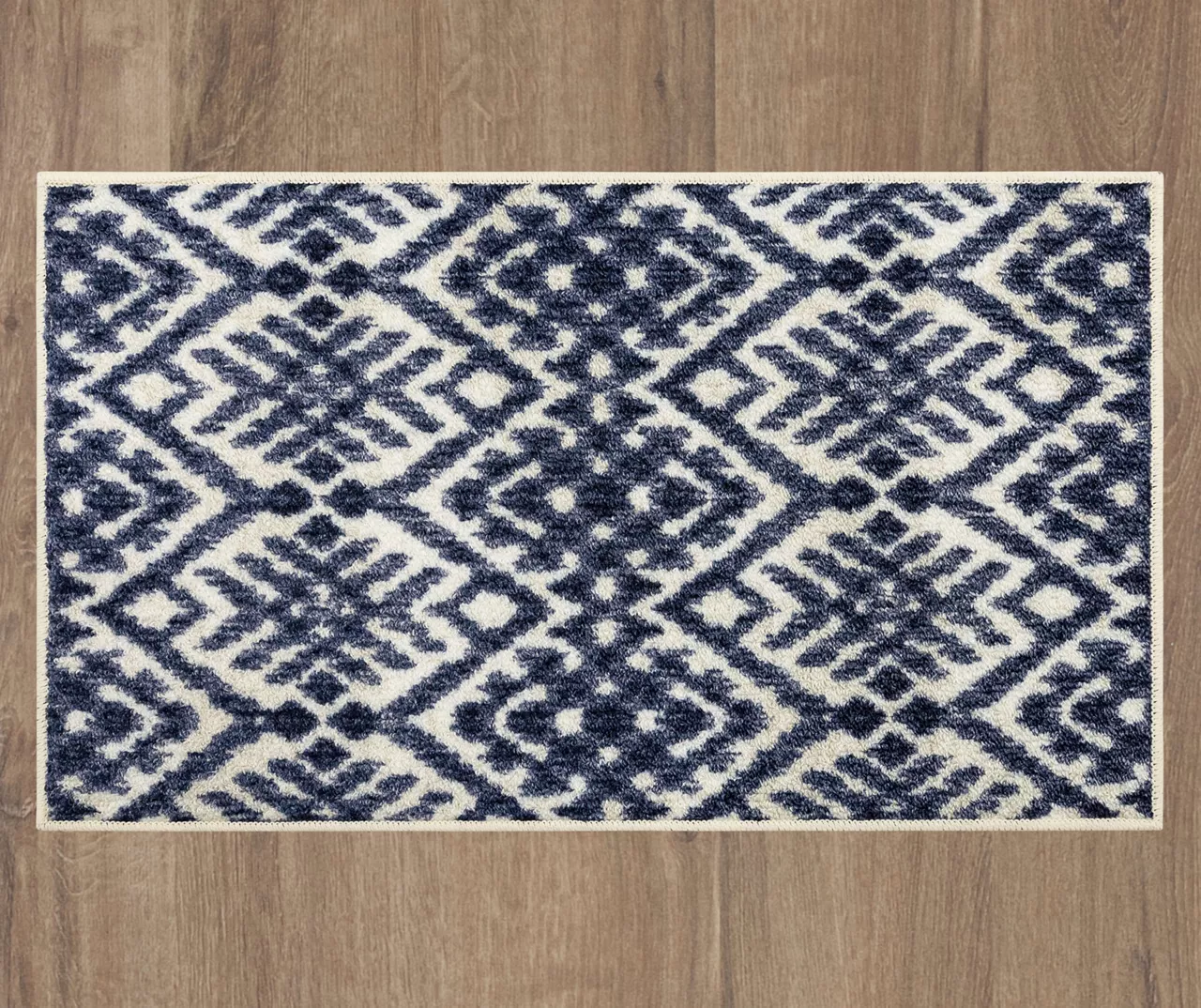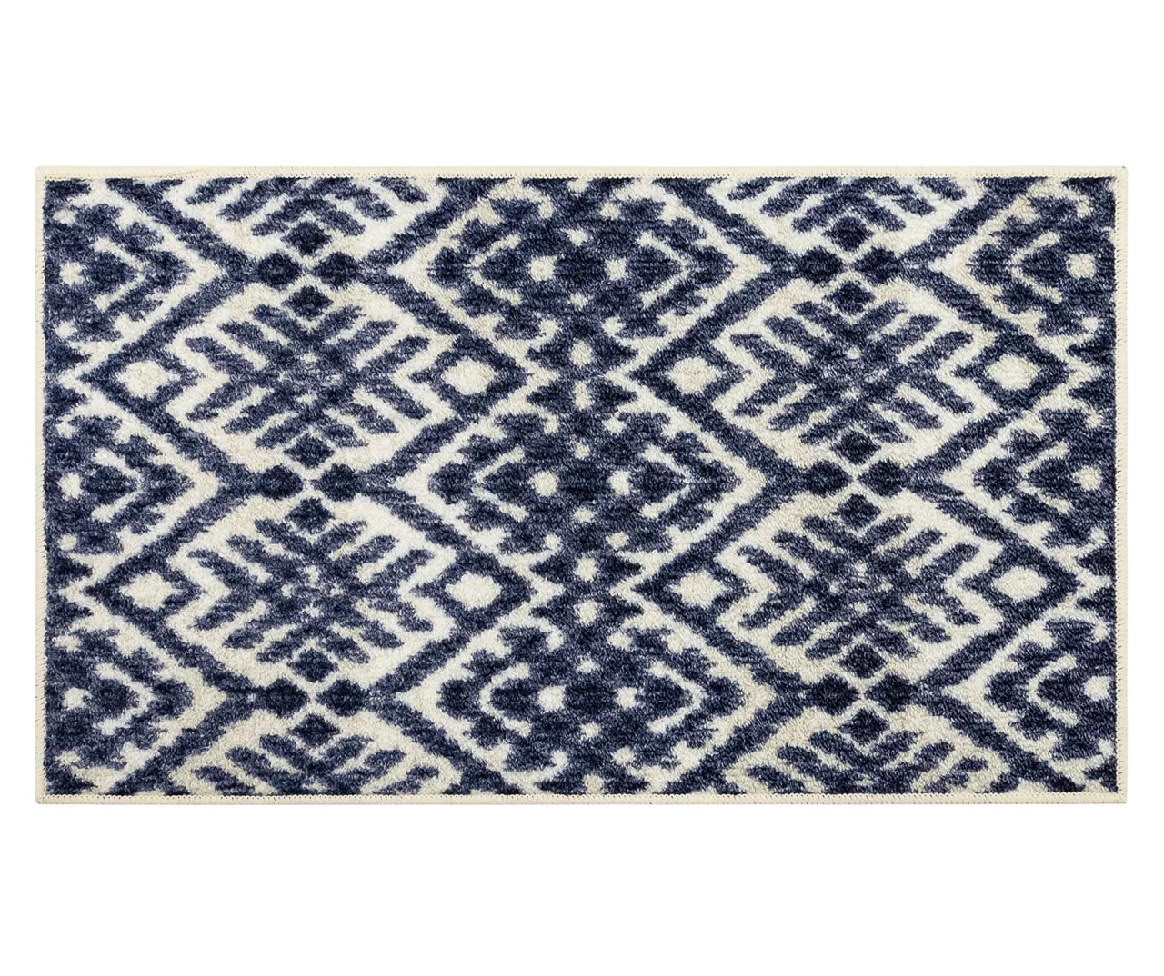 The Mohawk Home Orielle area rug features a geometric ikat-style motif in a rich navy and white color palette that is sure to perfectly accent any room. The low pile is created with Mohawk’s premium wear-dated nylon fiber for a soft touch and dependable durability. This rug is sure to make an elegant addition to a bedroom or other living space and the non-skid latex backing helps to keep things in place.