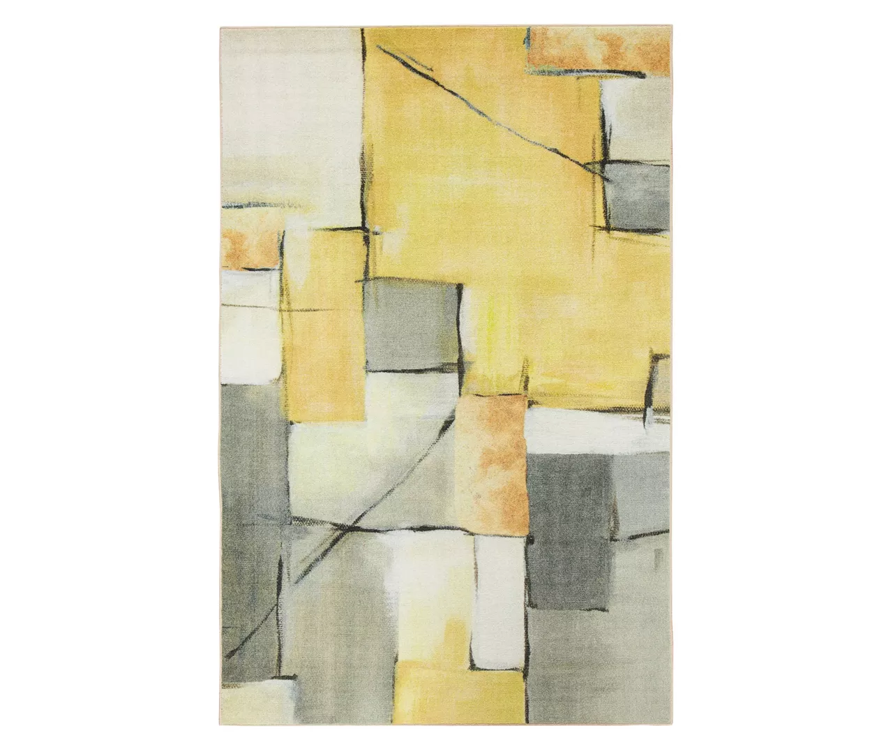 Watercolor-inspired washes of sunny yellow, crisp white, dark charcoal and silver gray contemporary color illuminate the abstract patchwork motif of Mohawk Home’s modern geometric area rug. Thoughtfully crafted in the U.S.A. utilizing Mohawk Home’s exclusive precision dye-injected printer, this rug is designed on a plush EverStrand™ tufted base made from premium recycled polyester. A non-skid latex backing helps to keep things in place, and the low pile is durably designed to easily work with doorways or furniture while withstanding everyday use.