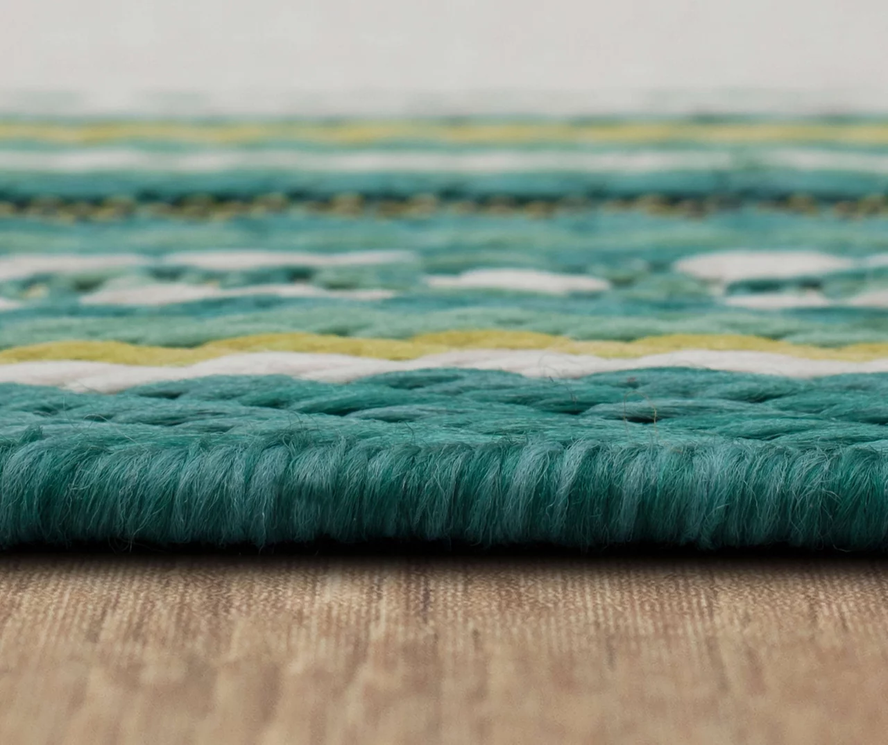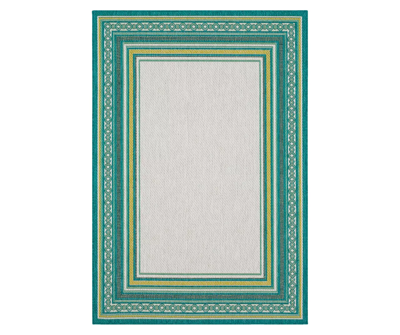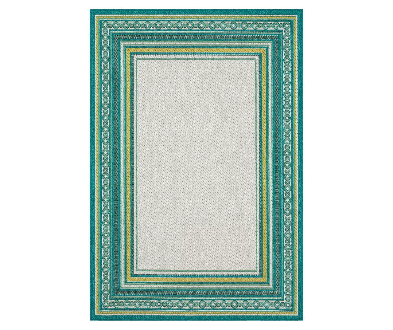 The Mohawk Home Panama area rug features a geometric border design in a palette of teal, green and white for a pop of color on your floors. Made with all-weather olefin polypropylene yarn, this flatwoven area rug offers a detailed design, soft feel and dependable durability that works in both indoor and outdoor spaces. The resilient surface fiber offers moisture, stain and fade resistance, making it a great choice for high-traffic areas.