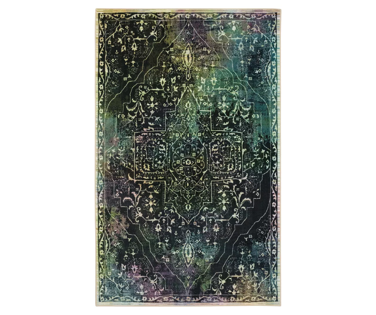 - Ornamental floral design in blended shades of black, blue, green and purple for a modern spin on a traditional look