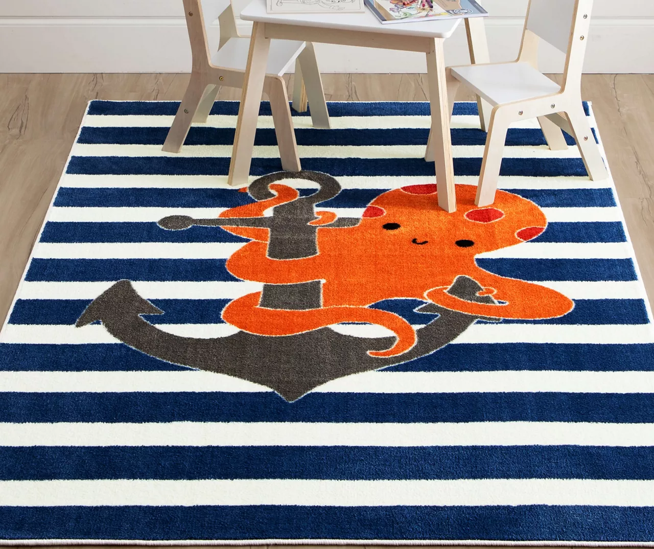 Friendly and fun, this rug from Mohawk features a cheerful octopus wrapped around an anchor in a nautically inspired motif. The low pile is created with Mohawk’s premium wear-dated nylon fiber for a soft touch and dependable durability. This rug is sure to make a delightful addition to a child’s play room, bedroom or other living space.