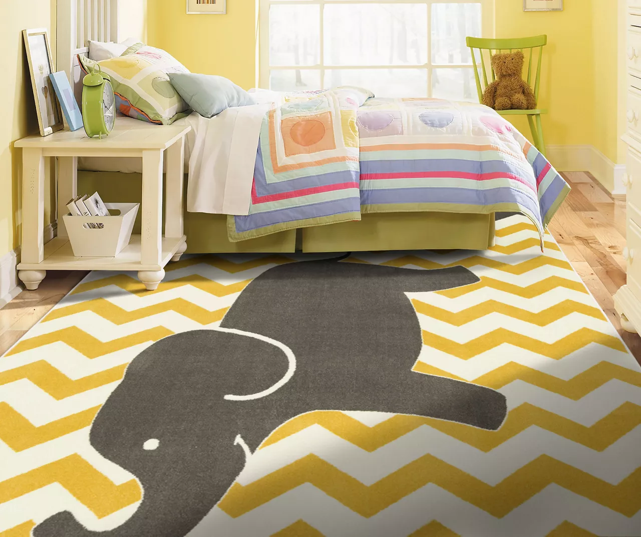 With a bright palette that’s perfectly on point, this elephant is as lucky as its name says! Mustard and white zigzag stripes dance in the shadows from this adorable gray elephant. The low pile is created with Mohawk’s premium wear-dated nylon fiber for a soft touch and dependable durability. This rug is sure to make a delightful addition to a child’s play room, bedroom or other living space.