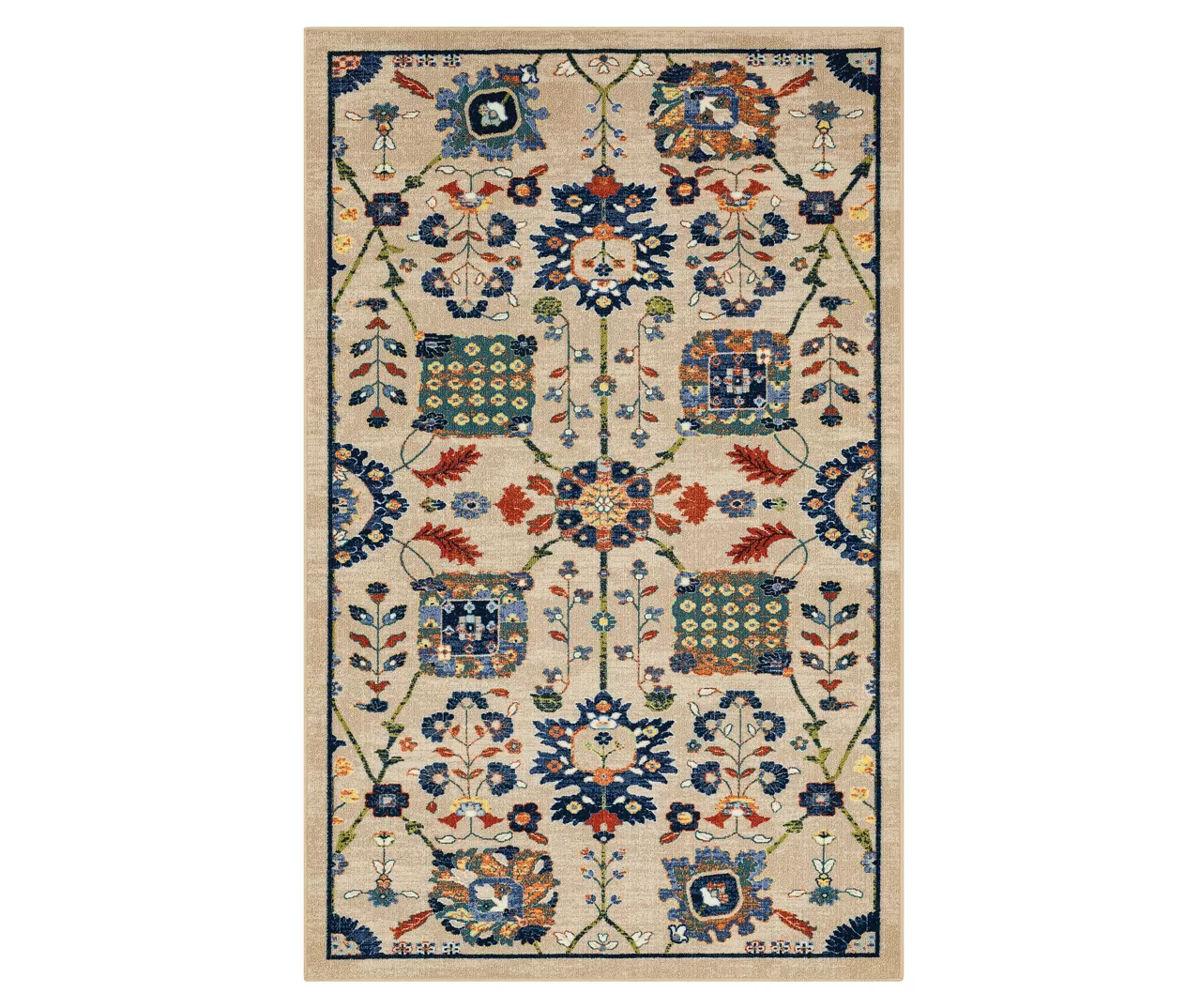 - Ornamental design with floral elements in shades of navy, red and orange for a traditional look