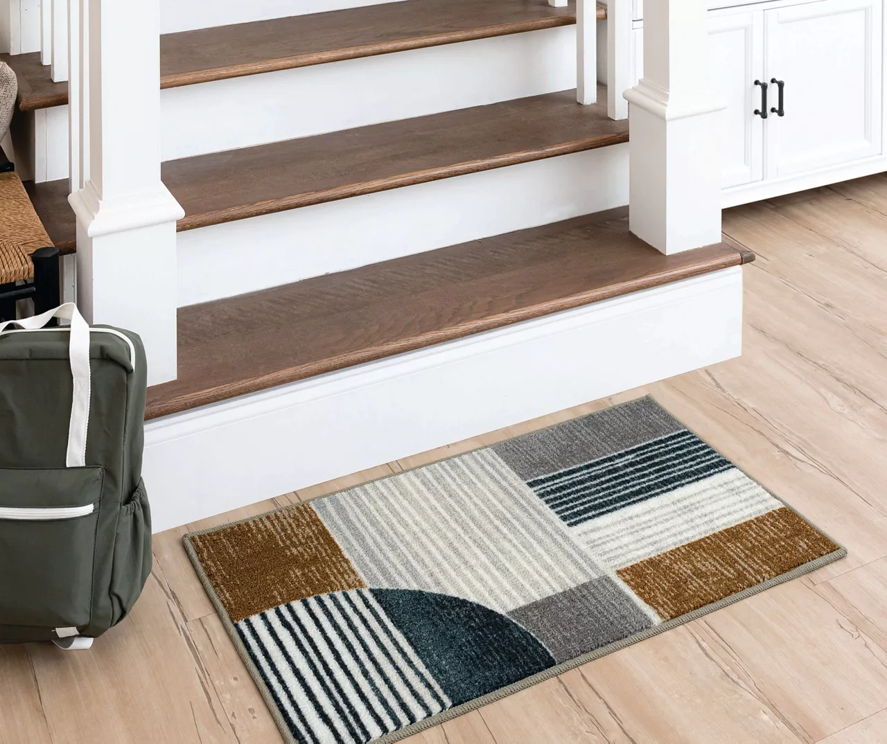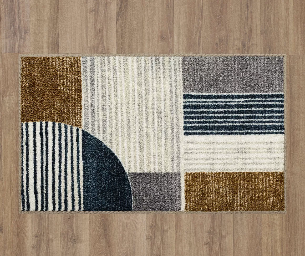 - Modern mid-century design with striped rectangle and rounded geometric shapes in muted shades of navy, gray, white and brown