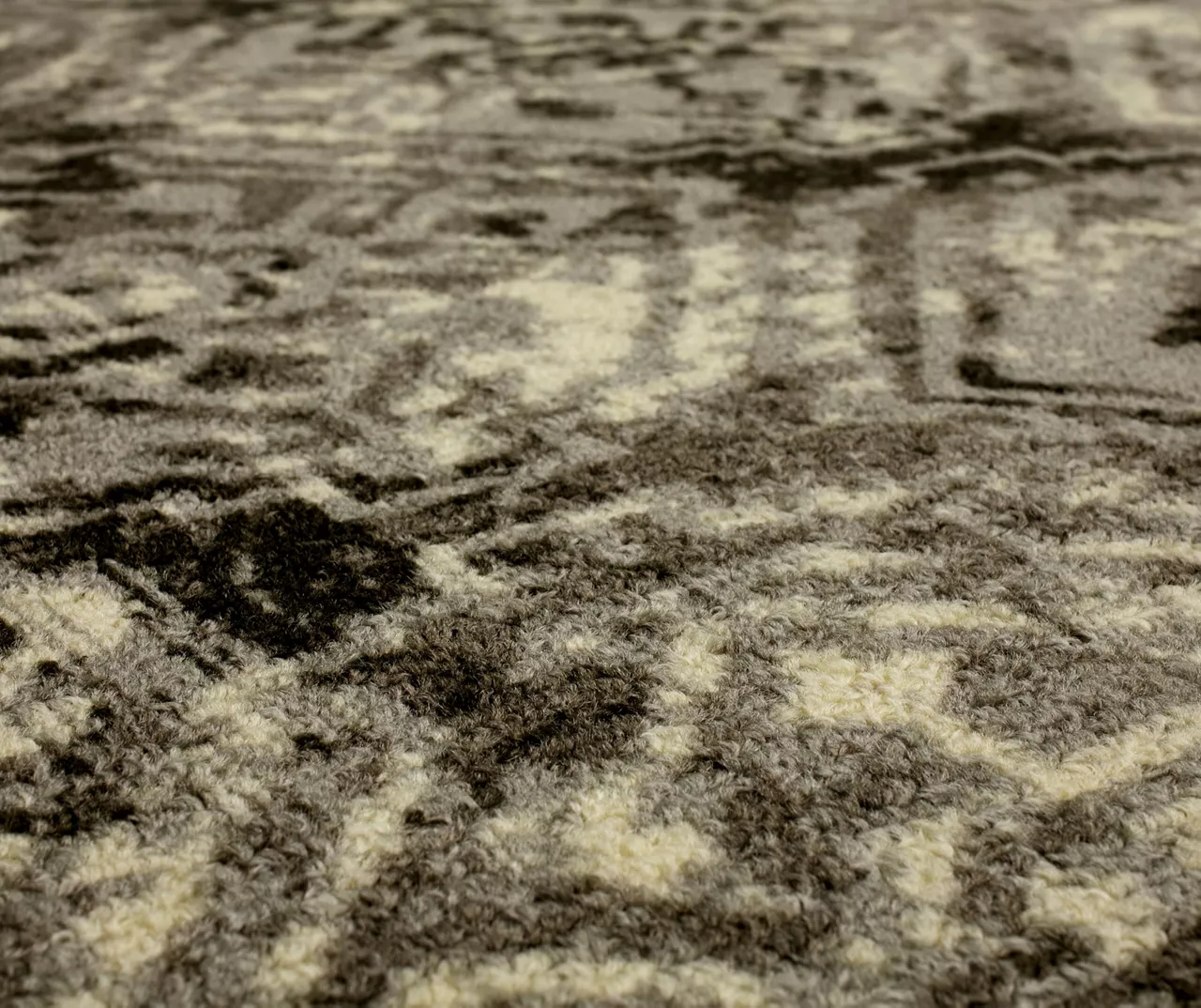 - Distressed arabesque design with a patterned border in neutral shades for a chic modern look