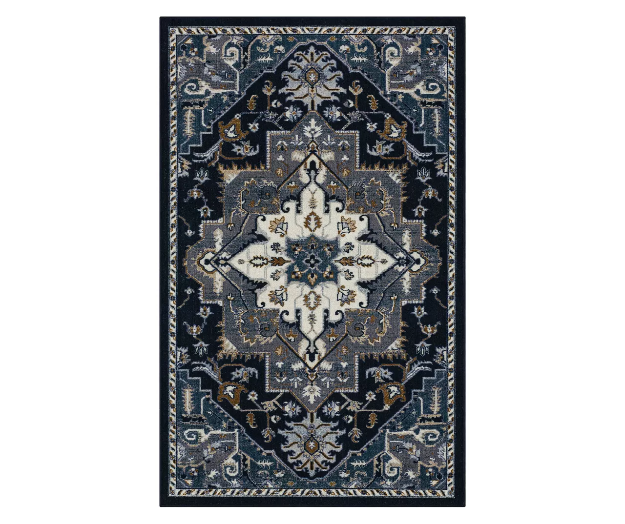 - Ornamental design with geometric elements in shades of navy and charcoal for a traditional look