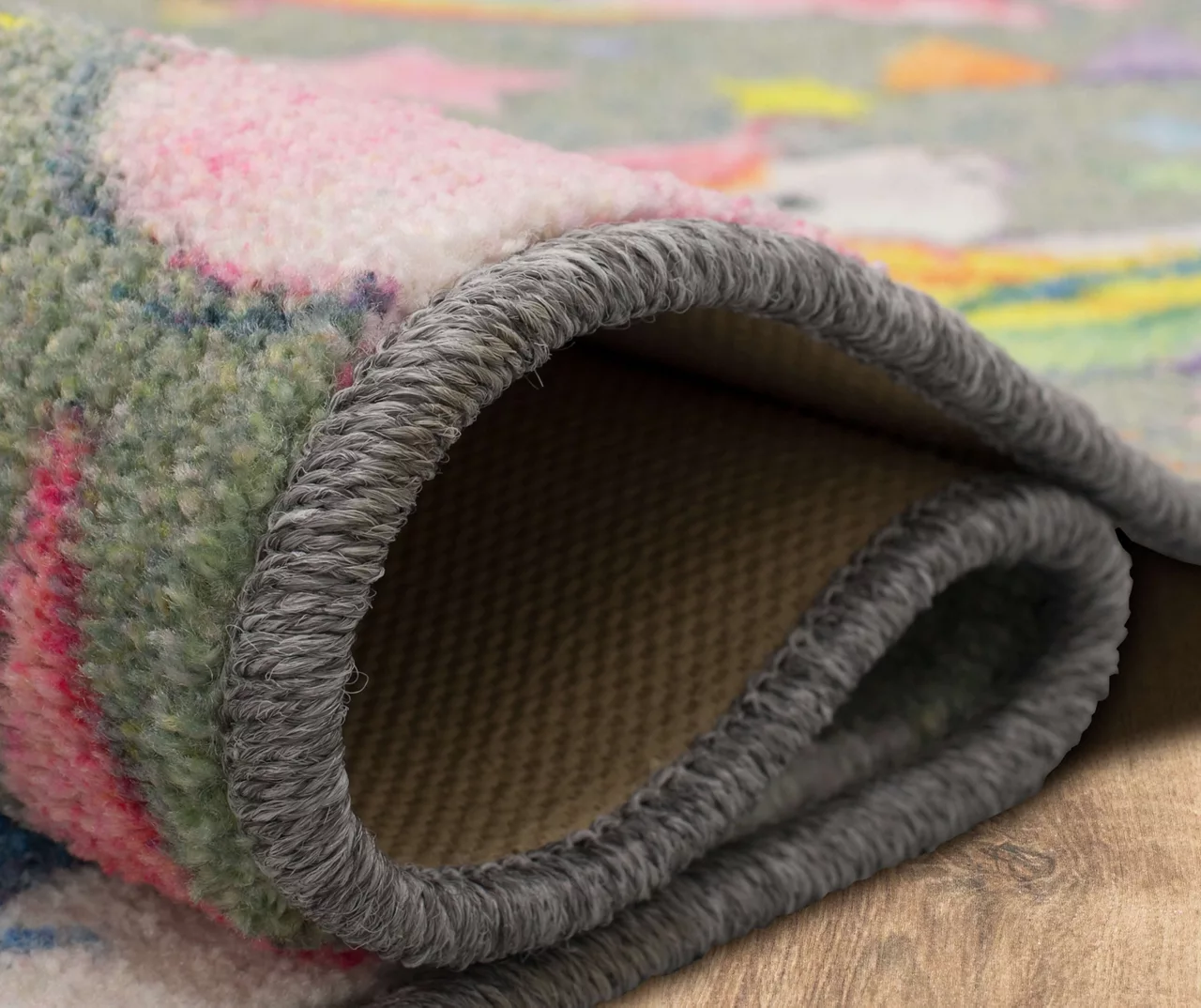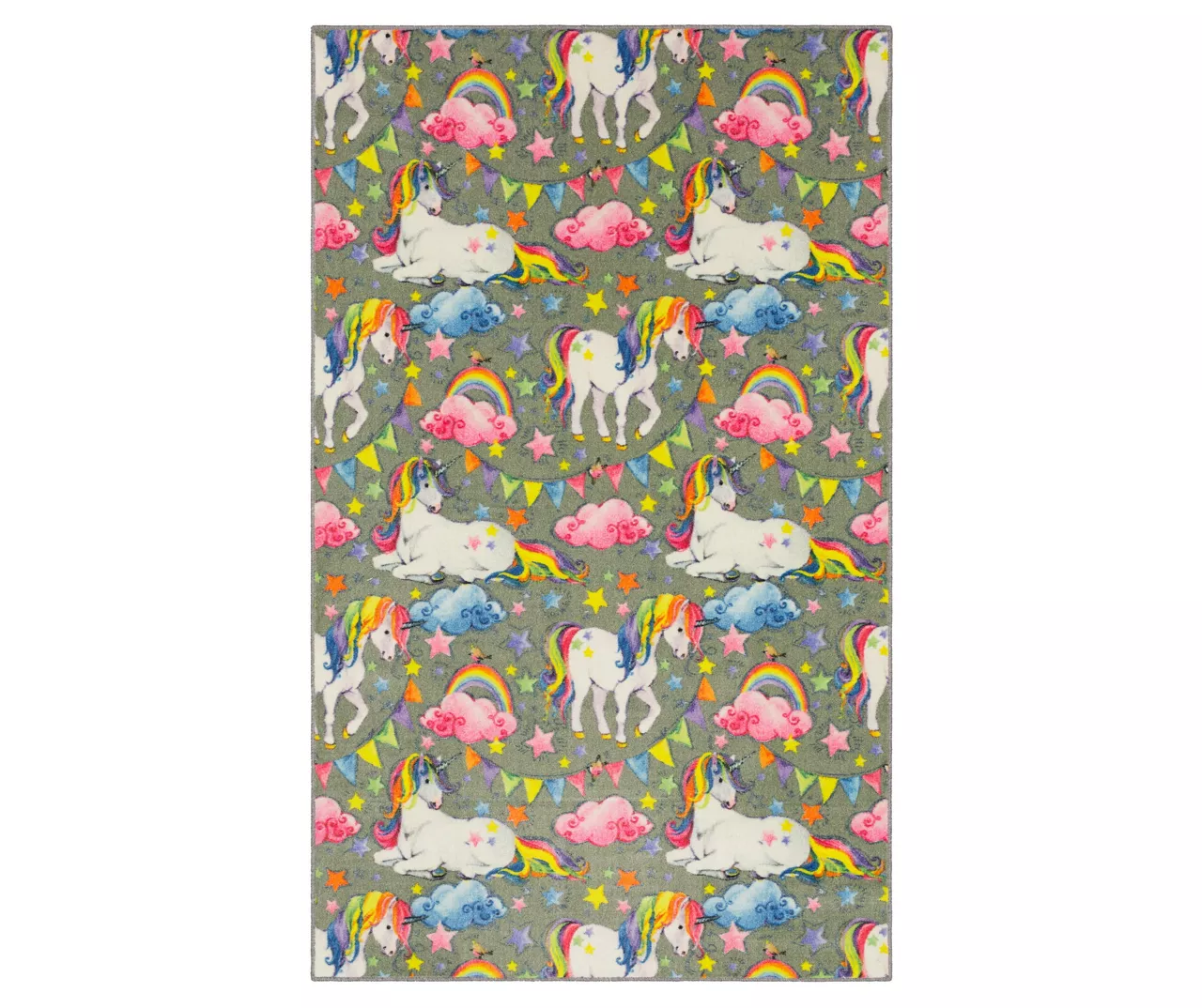Add some magic and whimsy to your little one’s bedroom or playroom with this unicorn-themed area rug! It features an array of colorful white unicorns with rainbow manes, colorful stars and bright banners on a gray background. Original artwork is digitally printed over a plush canvas of Mohawk Home’s exclusive EverStrand™, a premium synthetic yarn created from post-consumer recycled plastic bottles. While EverStrand™ is renowned for its softness, this silky yarn also offers superior strength, stain resistance, illustrious fade-resistant color clarity and dependable durability ideal for high-traffic spaces with kids and pets.