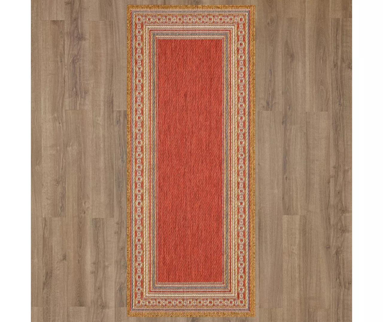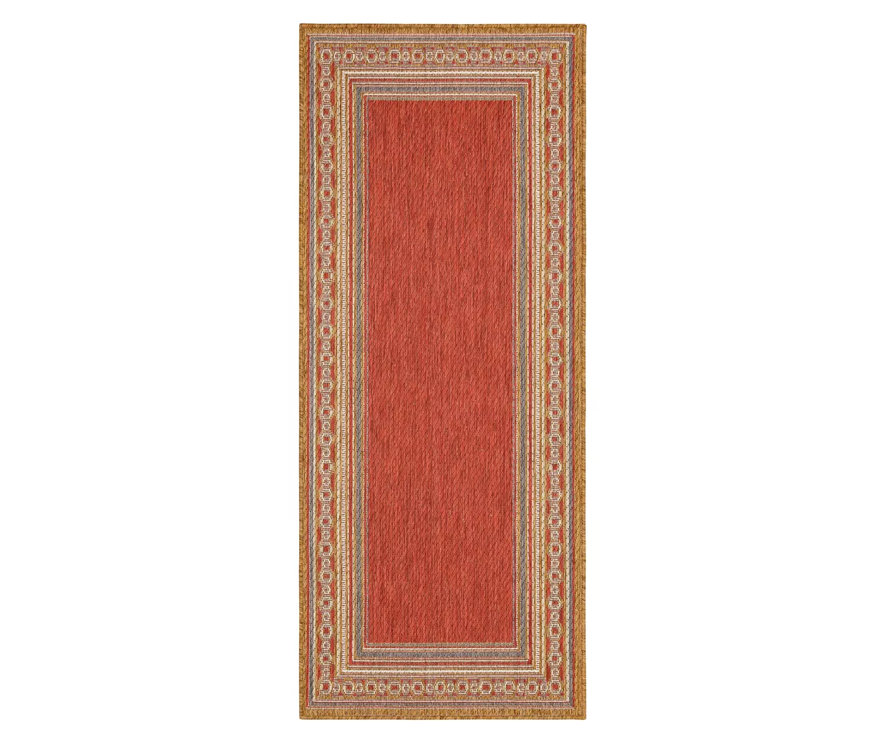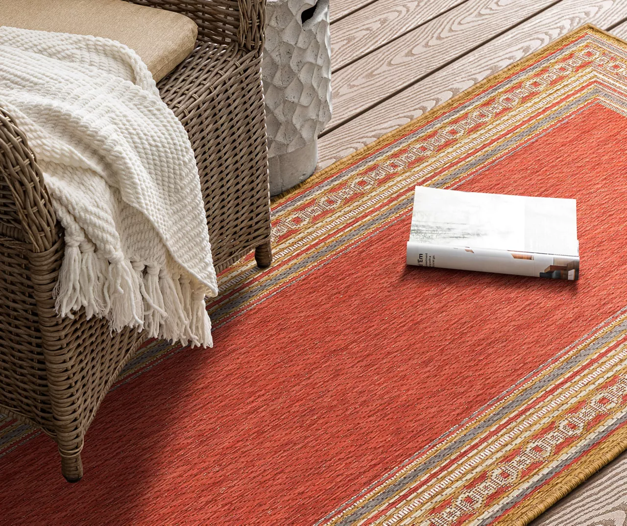 The Mohawk Home Panama area rug features a geometric border design in a palette of rust, gray and brown that easily complements your decor. Made with all-weather olefin polypropylene yarn, this flatwoven area rug offers a detailed design, soft feel and dependable durability that works in both indoor and outdoor spaces. The resilient surface fiber offers moisture, stain and fade resistance, making it a great choice for high-traffic areas.