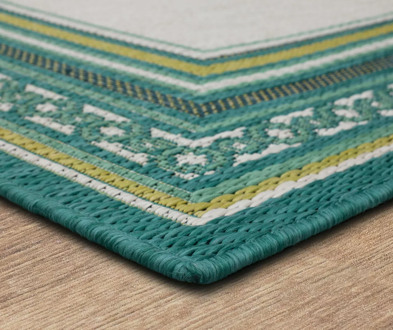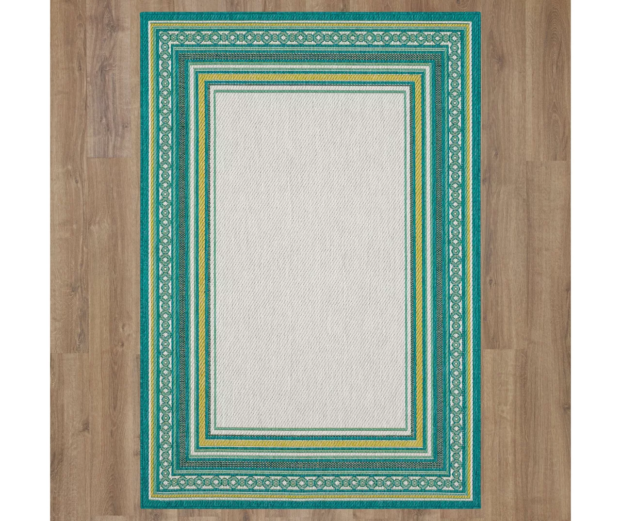 The Mohawk Home Panama area rug features a geometric border design in a palette of teal, green and white for a pop of color on your floors. Made with all-weather olefin polypropylene yarn, this flatwoven area rug offers a detailed design, soft feel and dependable durability that works in both indoor and outdoor spaces. The resilient surface fiber offers moisture, stain and fade resistance, making it a great choice for high-traffic areas.