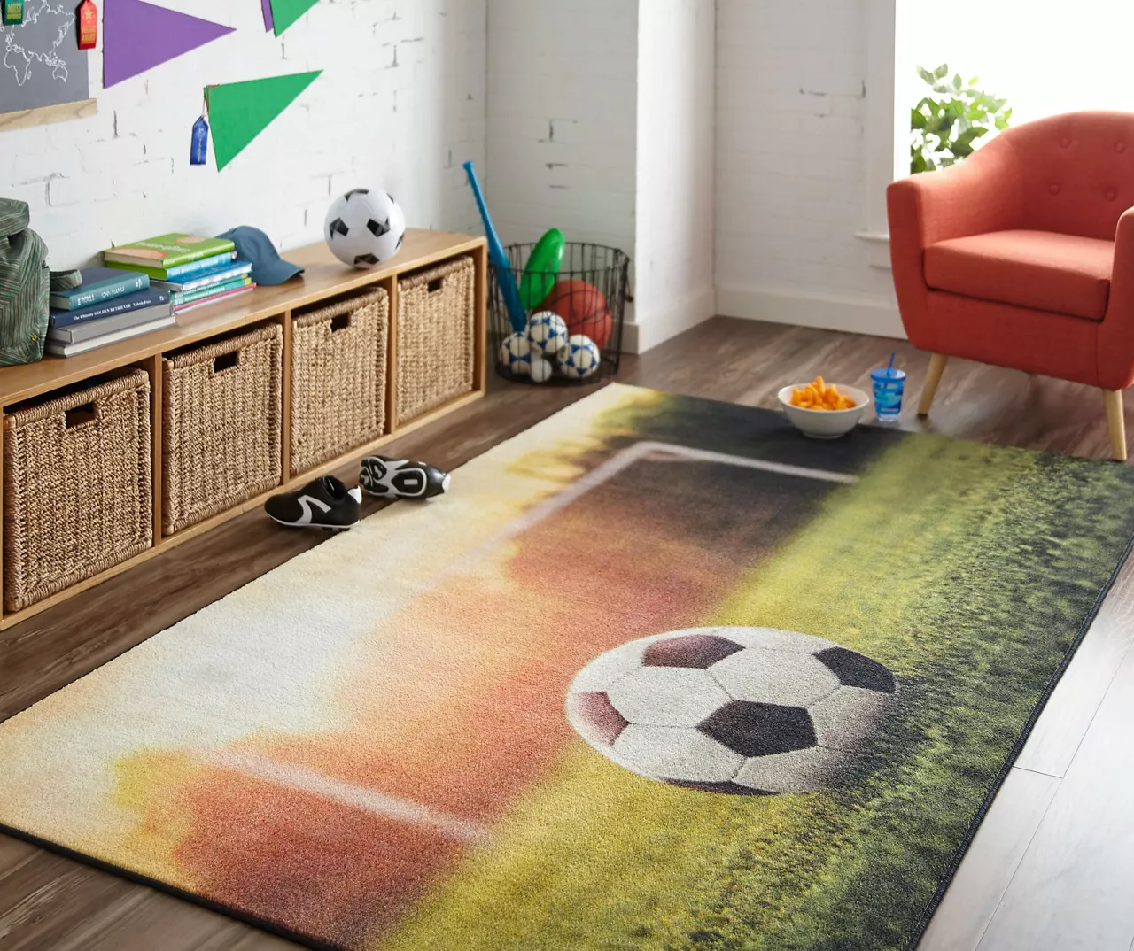 Score a big win and show your sporty side with the photo-realistic design of Mohawk Home’s Soccer Goal area rug. Thoughtfully crafted in the U.S.A. utilizing Mohawk Home’s exclusive precision dye-injected printer, this rug is designed on a plush EverStrand™ tufted base made from premium recycled polyester. A non-skid latex backing helps to keep things in place, and the low pile is durably designed to easily work with doorways or furniture while withstanding everyday use.