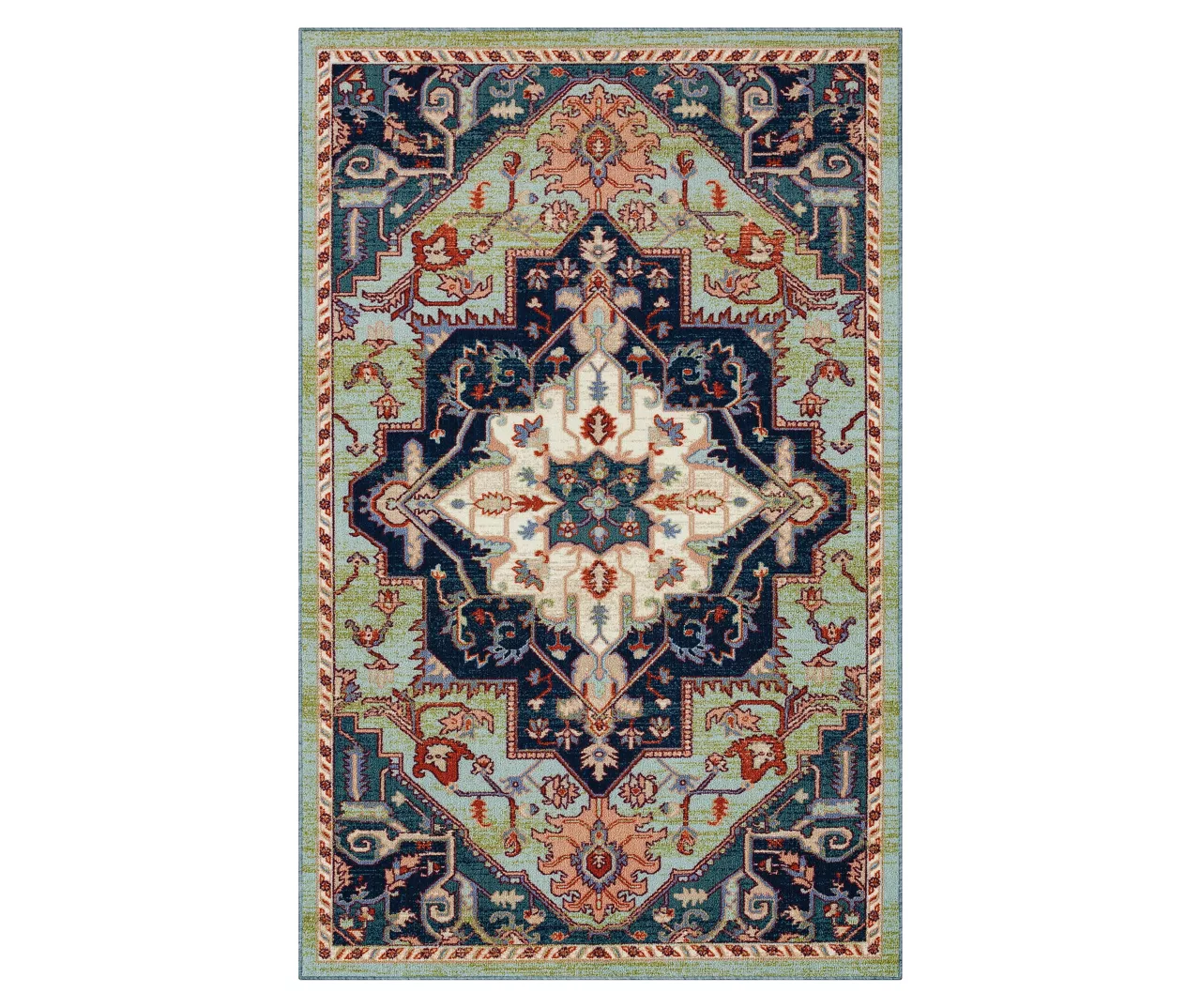 - Ornamental design with geometric elements in shades of green and blue for a traditional look
