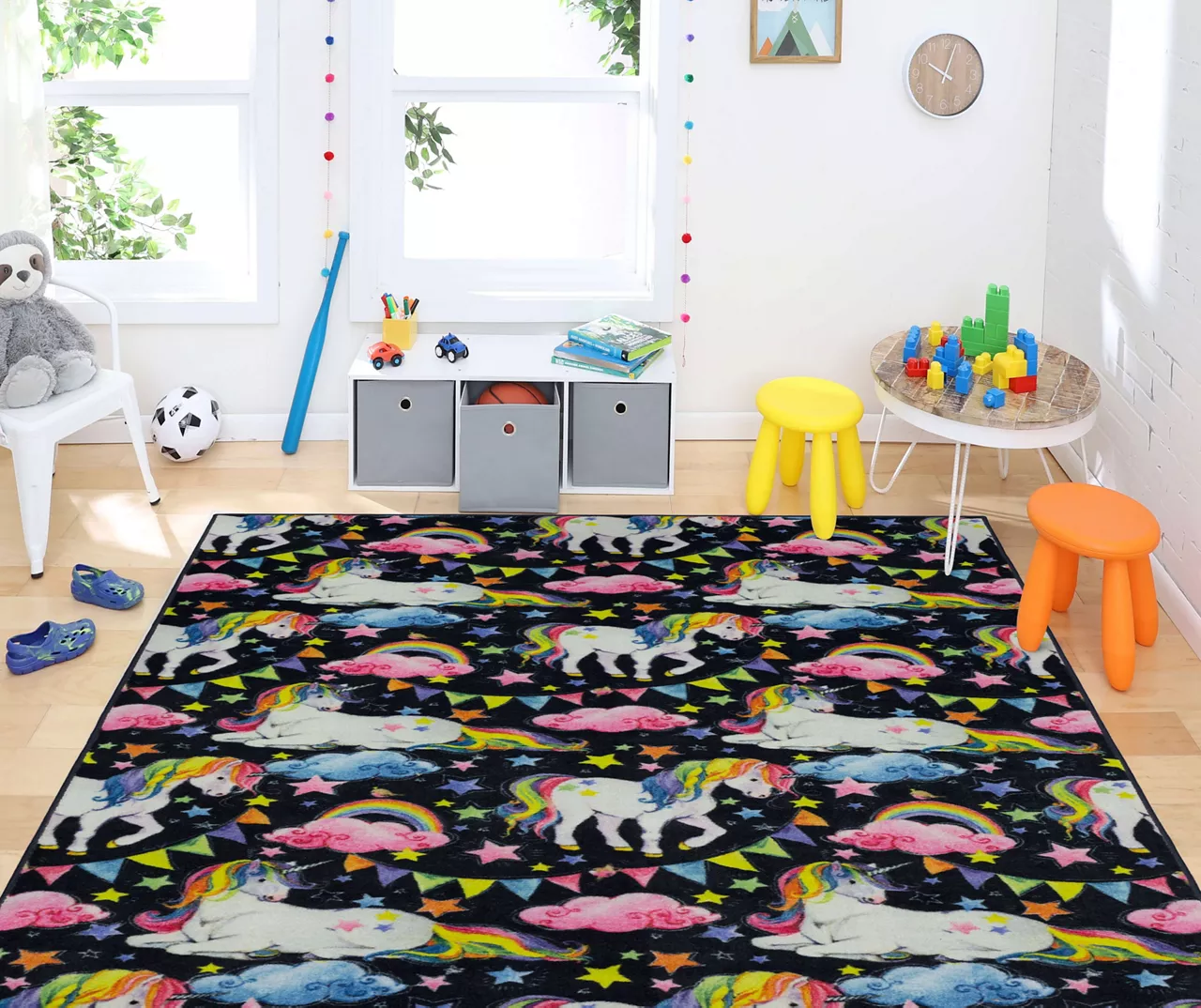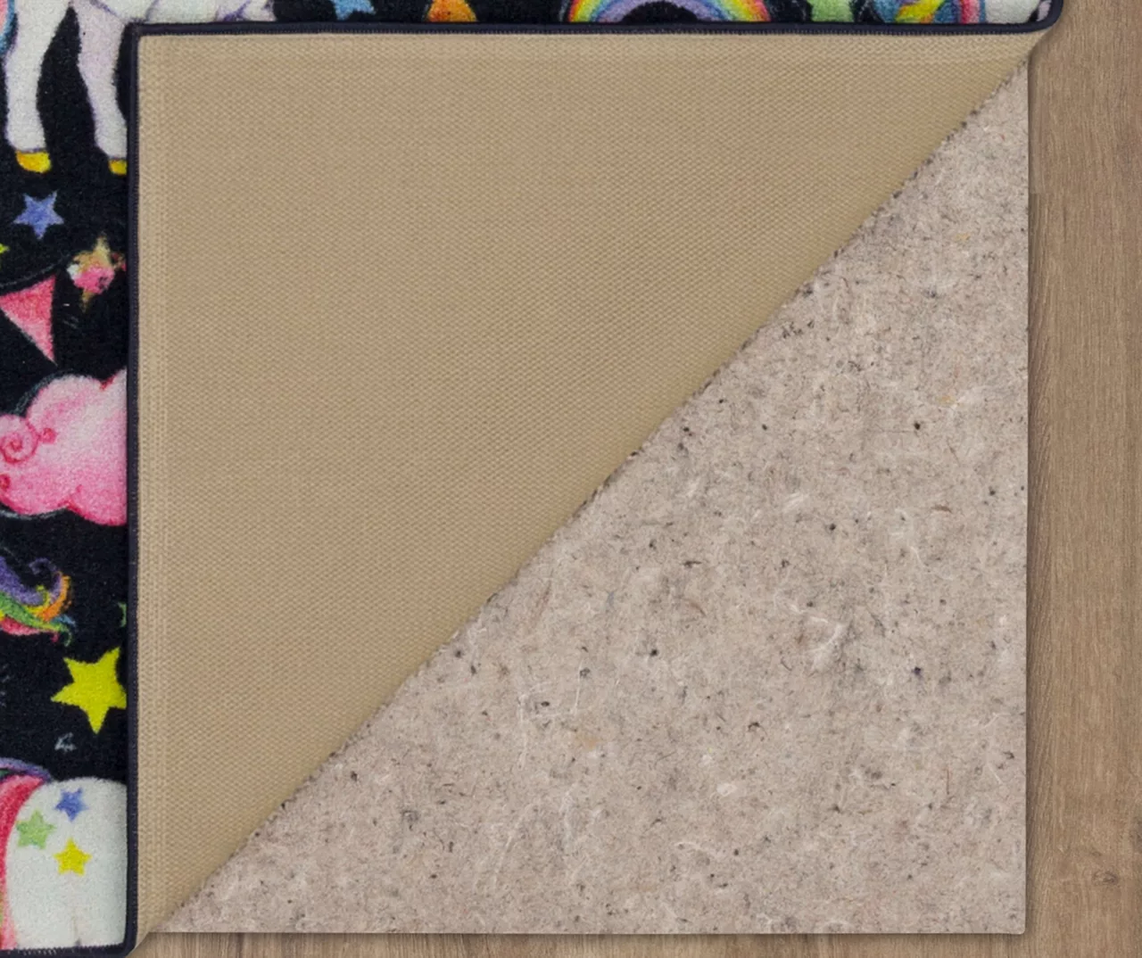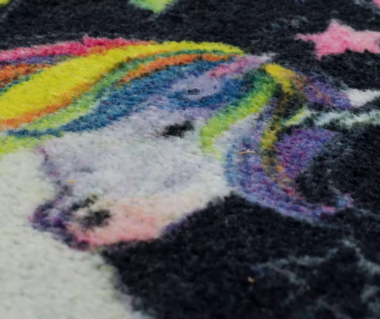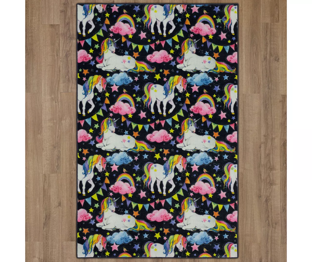 Add some magic and whimsy to your little one’s bedroom or playroom with this unicorn-themed area rug! It features an array of colorful white unicorns with rainbow manes, colorful stars and bright banners on a dark navy background. Original artwork is digitally printed over a plush canvas of Mohawk Home’s exclusive EverStrand™, a premium synthetic yarn created from post-consumer recycled plastic bottles. While EverStrand™ is renowned for its softness, this silky yarn also offers superior strength, stain resistance, illustrious fade-resistant color clarity and dependable durability ideal for high-traffic spaces with kids and pets.