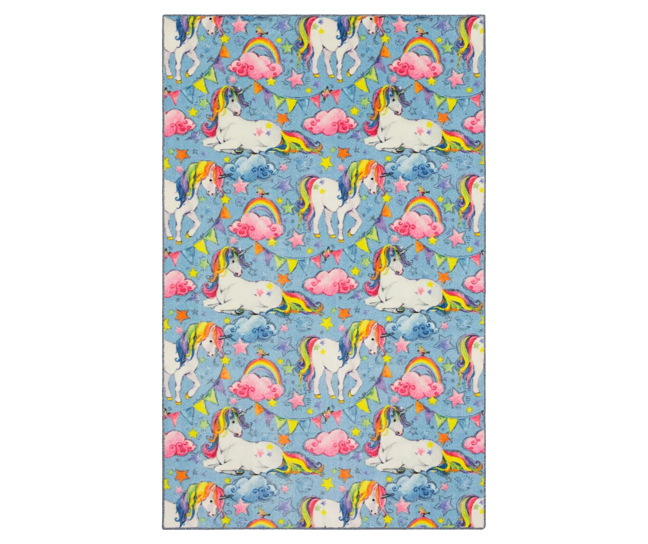 Add some magic and whimsy to your little one’s bedroom or playroom with this unicorn-themed area rug! It features an array of colorful white unicorns with rainbow manes, colorful stars and bright banners on a sky blue background. Original artwork is digitally printed over a plush canvas of Mohawk Home’s exclusive EverStrand™, a premium synthetic yarn created from post-consumer recycled plastic bottles. While EverStrand™ is renowned for its softness, this silky yarn also offers superior strength, stain resistance, illustrious fade-resistant color clarity and dependable durability ideal for high-traffic spaces with kids and pets.